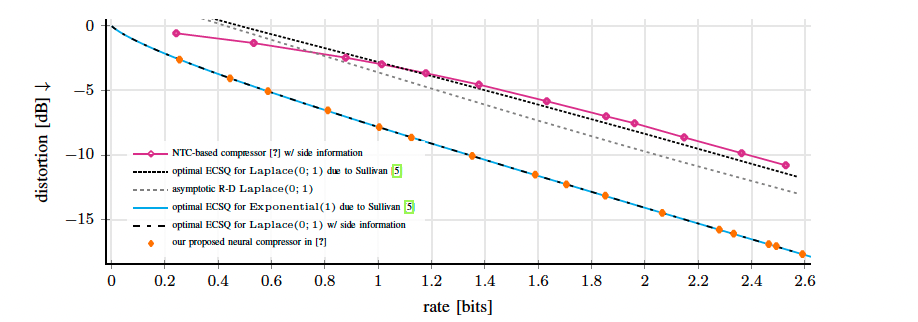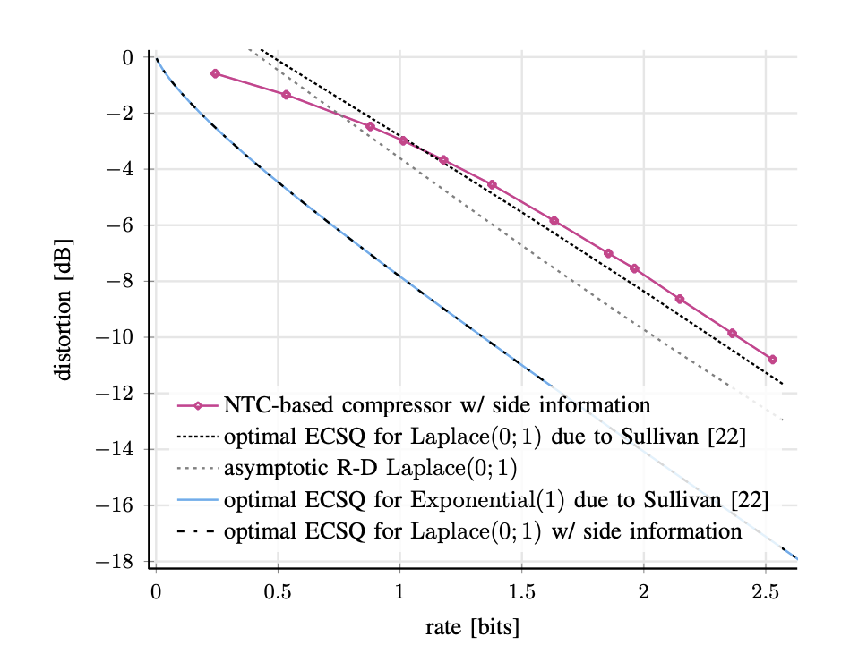 Fig. 1: Rate–distortion performances (R-D) obtained with Nonlinear Transform Coding (NTC) [4], which is adapted to incorporate the available side information as the objective function. We consider a simple one-shot source coding with side information setup: let X ∼ Laplace(0; 1) and Y = sgn(X), i.e., the sign function of the input realization, and let the distortion metric d(·, ·) be mean-squared error. Unlike the class of state-of-the-art methods, termed NTC, our proposed formulation in [3] recovers the theoretically optimum R-D function with side information.