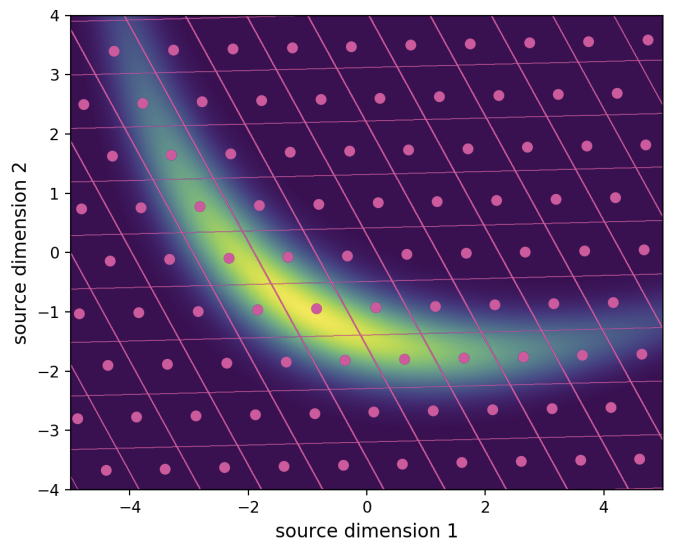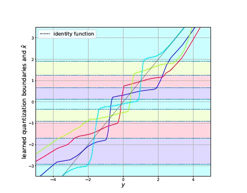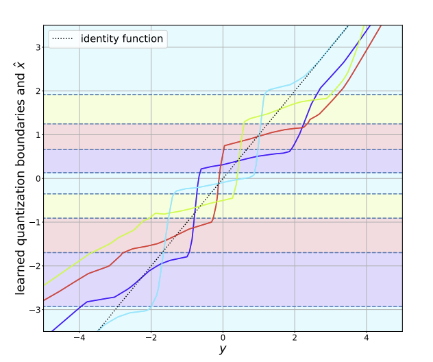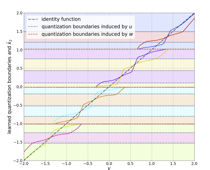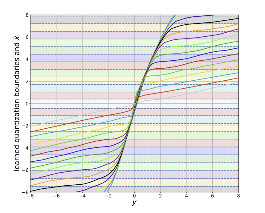Fig. 2: Figure taken from [2]. Visualization (best viewed in color) of the learned encoder and decoder of the operational scheme proposed in [2], for the quadratic-Gaussian Wyner–Ziv setup. The dashed horizontal lines are quantization boundaries, and the colors between boundaries represent unique values of bin indices. The decoding function is depicted as separate plots for each value of bin index, using the same color assignment. Color coding reveals that our proposed model learns discontiguous quantization bins.